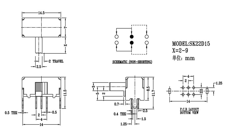 Slide Switch Main data Rating:DC 50V 0.3A~1A ContactResistance:< 100 mΩ InsulationResistance:≥ 100 MΩ Withstand Voltage:500V AC for 1 minute Operating Force:180~500gf Life cycles:10000次 Operationg Temperature:-16℃to+60℃ Storage Temperature:-40℃to+85℃ Complies with:RoHs&Reach