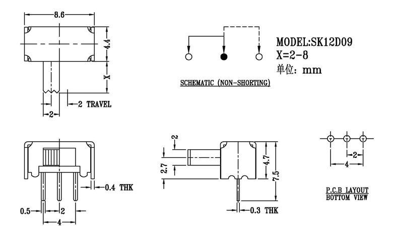 Slide Switch Main data Rating:DC 50V 0.3A~1A ContactResistance:< 100 mΩ InsulationResistance:≥ 100 MΩ Withstand Voltage:500V AC for 1 minute Operating Force:180~500gf Life cycles:10000次 Operationg Temperature:-16℃to+60℃ Storage Temperature:-40℃to+85℃ Complies with:RoHs&Reach
