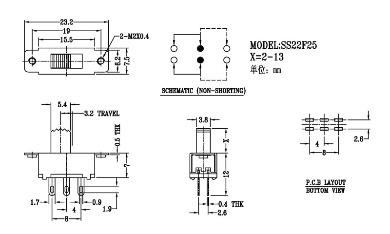 Slide Switch Main data Rating:DC 50V 0.3A~1A ContactResistance:< 100 mΩ InsulationResistance:≥ 100 MΩ Withstand Voltage:500V AC for 1 minute Operating Force:180~500gf Life cycles:10000次 Operationg Temperature:-16℃to+60℃ Storage Temperature:-40℃to+85℃ Complies with:RoHs&Reach