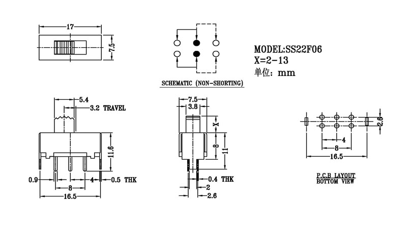 Slide Switch Main data Rating:DC 50V 0.3A~1A ContactResistance:< 100 mΩ InsulationResistance:≥ 100 MΩ Withstand Voltage:500V AC for 1 minute Operating Force:180~500gf Life cycles:10000次 Operationg Temperature:-16℃to+60℃ Storage Temperature:-40℃to+85℃ Complies with:RoHs&Reach