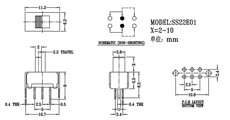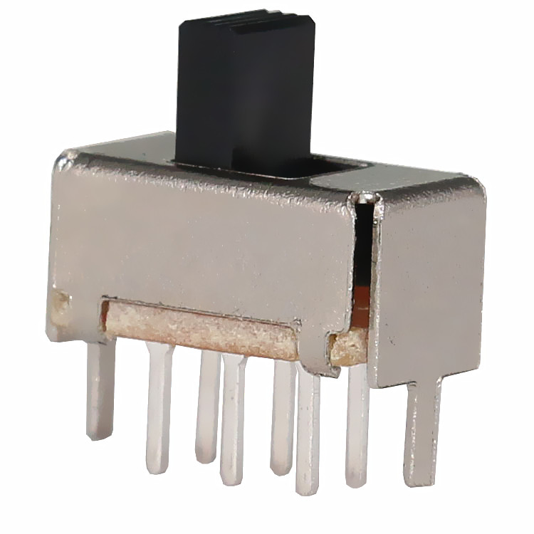 Slide Switch Main data Rating:DC 50V 0.3A~1A ContactResistance:< 100 mΩ InsulationResistance:≥ 100 MΩ Withstand Voltage:500V AC for 1 minute Operating Force:180~500gf Life cycles:10000次 Operationg Temperature:-16℃to+60℃ Storage Temperature:-40℃to+85℃ Complies with:RoHs&Reach