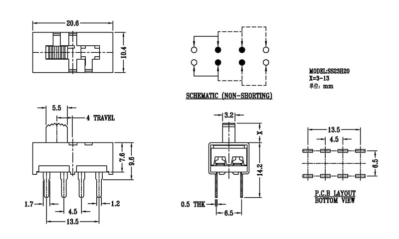 Slide Switch Main data Rating:DC 50V 0.3A~1A ContactResistance:< 100 mΩ InsulationResistance:≥ 100 MΩ Withstand Voltage:500V AC for 1 minute Operating Force:180~500gf Life cycles:10000次 Operationg Temperature:-16℃to+60℃ Storage Temperature:-40℃to+85℃ Complies with:RoHs&Reach