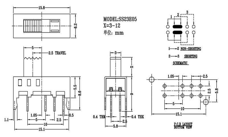Slide Switch Main data Rating:DC 50V 0.3A~1A ContactResistance:< 100 mΩ InsulationResistance:≥ 100 MΩ Withstand Voltage:500V AC for 1 minute Operating Force:180~500gf Life cycles:10000次 Operationg Temperature:-16℃to+60℃ Storage Temperature:-40℃to+85℃ Complies with:RoHs&Reach