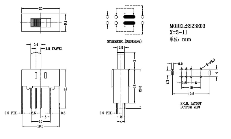 Slide Switch Main data Rating:DC 50V 0.3A~1A ContactResistance:< 100 mΩ InsulationResistance:≥ 100 MΩ Withstand Voltage:500V AC for 1 minute Operating Force:180~500gf Life cycles:10000次 Operationg Temperature:-16℃to+60℃ Storage Temperature:-40℃to+85℃ Complies with:RoHs&Reach