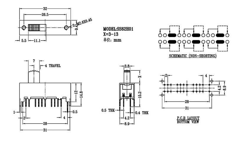 Slide Switch Main data Rating:DC 50V 0.3A~1A ContactResistance:< 100 mΩ InsulationResistance:≥ 100 MΩ Withstand Voltage:500V AC for 1 minute Operating Force:180~500gf Life cycles:10000次 Operationg Temperature:-16℃to+60℃ Storage Temperature:-40℃to+85℃ Complies with:RoHs&Reach