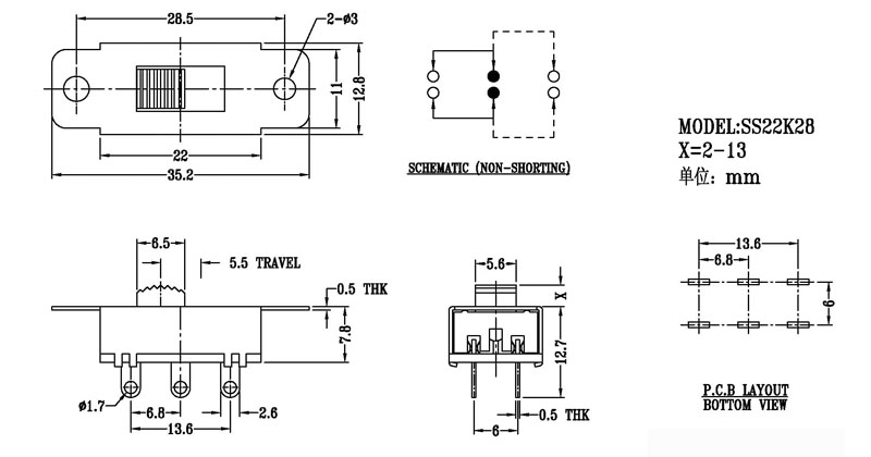 Slide Switch Main data Rating:DC 50V 0.3A~1A ContactResistance:< 100 mΩ InsulationResistance:≥ 100 MΩ Withstand Voltage:500V AC for 1 minute Operating Force:180~500gf Life cycles:10000次 Operationg Temperature:-16℃to+60℃ Storage Temperature:-40℃to+85℃ Complies with:RoHs&Reach