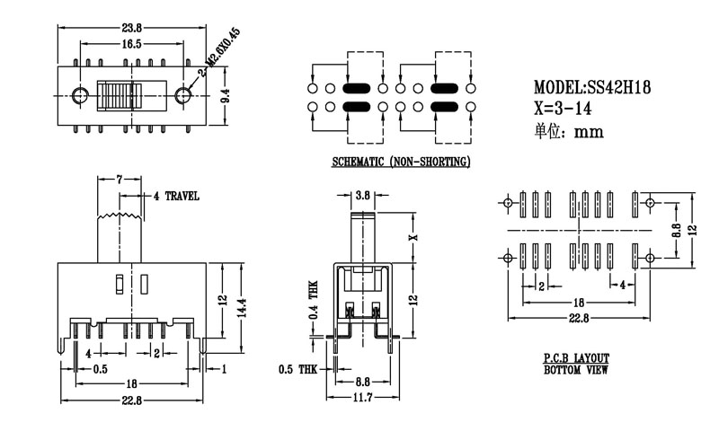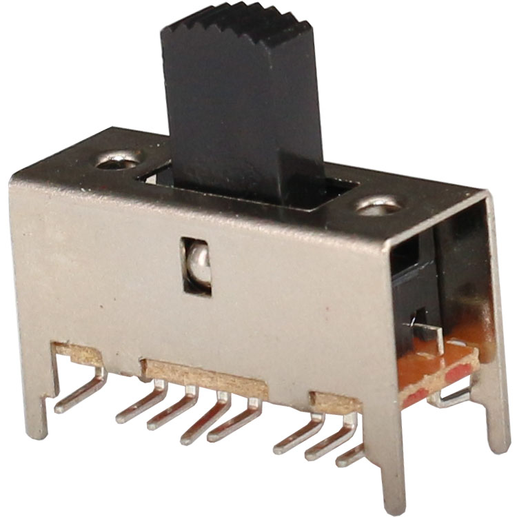 Slide Switch Main data Rating:DC 50V 0.3A~1A ContactResistance:< 100 mΩ InsulationResistance:≥ 100 MΩ Withstand Voltage:500V AC for 1 minute Operating Force:180~500gf Life cycles:10000次 Operationg Temperature:-16℃to+60℃ Storage Temperature:-40℃to+85℃ Complies with:RoHs&Reach