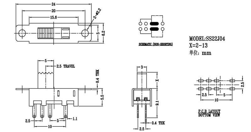 Slide Switch Main data Rating:DC 50V 0.3A~1A ContactResistance:< 100 mΩ InsulationResistance:≥ 100 MΩ Withstand Voltage:500V AC for 1 minute Operating Force:180~500gf Life cycles:10000次 Operationg Temperature:-16℃to+60℃ Storage Temperature:-40℃to+85℃ Complies with:RoHs&Reach
