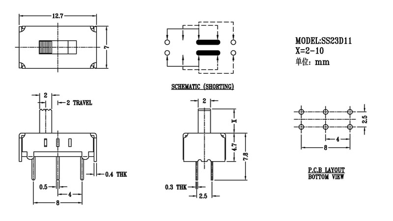 Slide Switch Main data Rating:DC 50V 0.3A~1A ContactResistance:< 100 mΩ InsulationResistance:≥ 100 MΩ Withstand Voltage:500V AC for 1 minute Operating Force:180~500gf Life cycles:10000次 Operationg Temperature:-16℃to+60℃ Storage Temperature:-40℃to+85℃ Complies with:RoHs&Reach