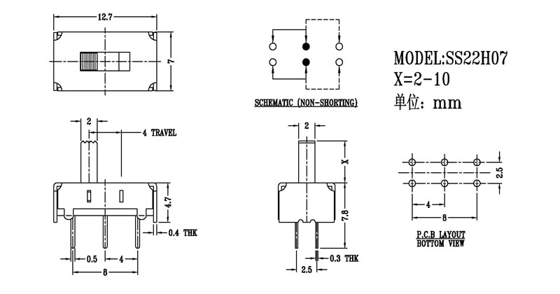 Slide Switch Main data Rating:DC 50V 0.3A~1A ContactResistance:< 100 mΩ InsulationResistance:≥ 100 MΩ Withstand Voltage:500V AC for 1 minute Operating Force:180~500gf Life cycles:10000次 Operationg Temperature:-16℃to+60℃ Storage Temperature:-40℃to+85℃ Complies with:RoHs&Reach