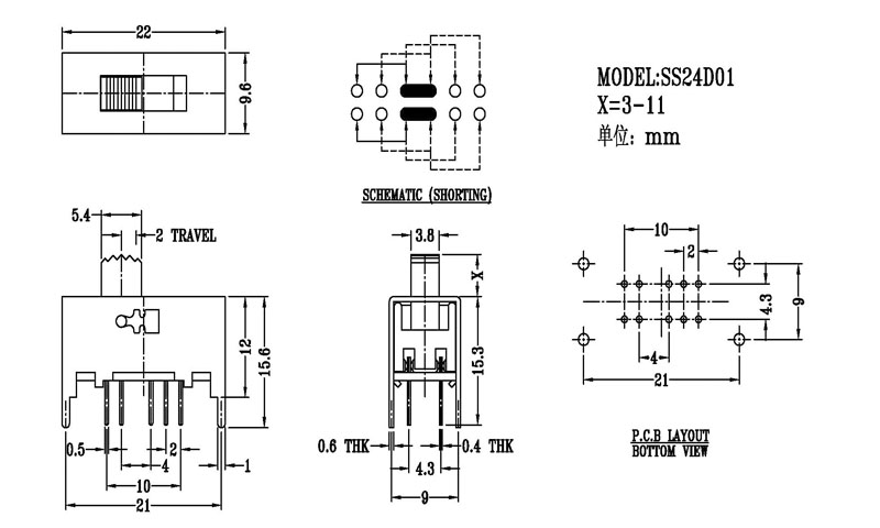 Slide Switch Main data Rating:DC 50V 0.3A~1A ContactResistance:< 100 mΩ InsulationResistance:≥ 100 MΩ Withstand Voltage:500V AC for 1 minute Operating Force:180~500gf Life cycles:10000次 Operationg Temperature:-16℃to+60℃ Storage Temperature:-40℃to+85℃ Complies with:RoHs&Reach