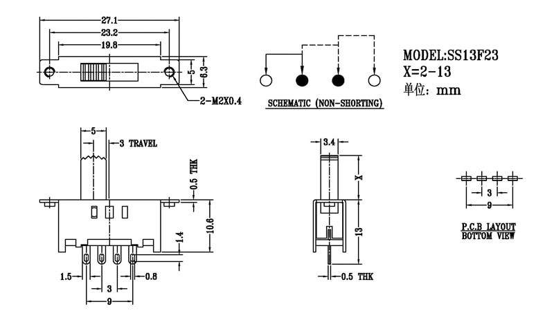 Slide Switch Main data Rating:DC 50V 0.3A~1A ContactResistance:< 100 mΩ InsulationResistance:≥ 100 MΩ Withstand Voltage:500V AC for 1 minute Operating Force:180~500gf Life cycles:10000次 Operationg Temperature:-16℃to+60℃ Storage Temperature:-40℃to+85℃ Complies with:RoHs&Reach