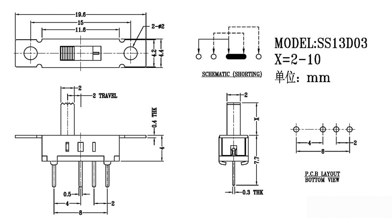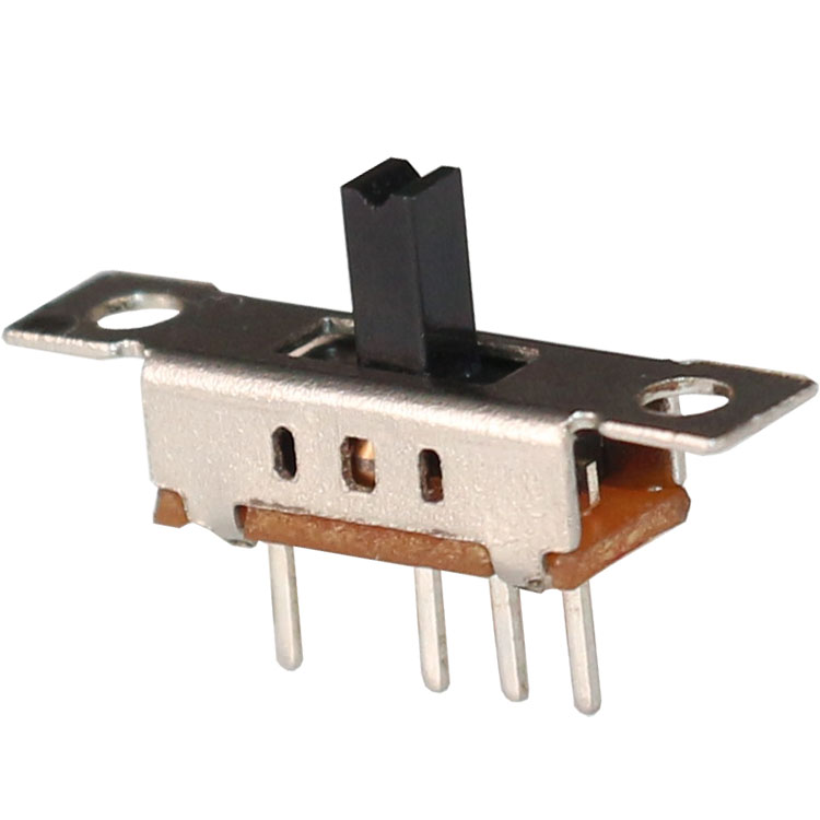 Slide Switch Main data Rating:DC 50V 0.3A~1A ContactResistance:< 100 mΩ InsulationResistance:≥ 100 MΩ Withstand Voltage:500V AC for 1 minute Operating Force:180~500gf Life cycles:10000次 Operationg Temperature:-16℃to+60℃ Storage Temperature:-40℃to+85℃ Complies with:RoHs&Reach