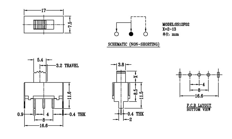 Slide Switch Main data Rating:DC 50V 0.3A~1A ContactResistance:< 100 mΩ InsulationResistance:≥ 100 MΩ Withstand Voltage:500V AC for 1 minute Operating Force:180~500gf Life cycles:10000次 Operationg Temperature:-16℃to+60℃ Storage Temperature:-40℃to+85℃ Complies with:RoHs&Reach