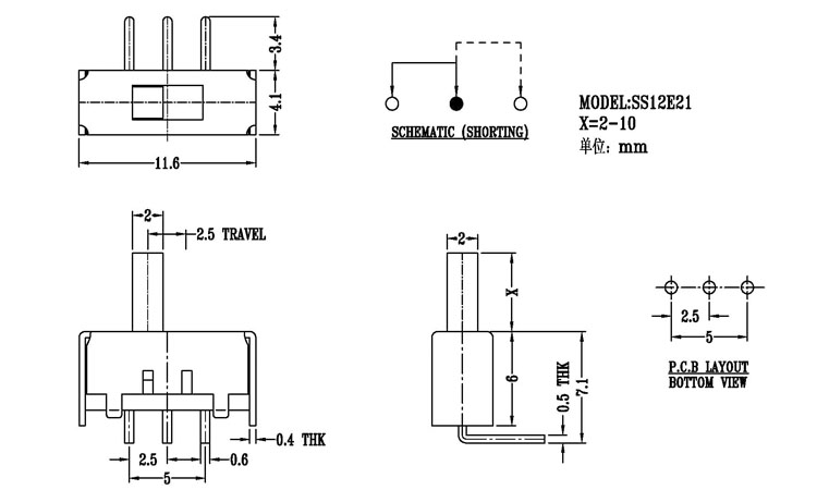 Slide Switch Main data Rating:DC 50V 0.3A~1A ContactResistance:< 100 mΩ InsulationResistance:≥ 100 MΩ Withstand Voltage:500V AC for 1 minute Operating Force:180~500gf Life cycles:10000次 Operationg Temperature:-16℃to+60℃ Storage Temperature:-40℃to+85℃ Complies with:RoHs&Reach