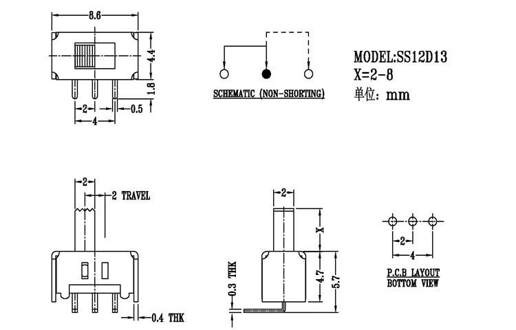 Slide Switch Main data Rating:DC 50V 0.3A~1A ContactResistance:< 100 mΩ InsulationResistance:≥ 100 MΩ Withstand Voltage:500V AC for 1 minute Operating Force:180~500gf Life cycles:10000次 Operationg Temperature:-16℃to+60℃ Storage Temperature:-40℃to+85℃ Complies with:RoHs&Reach