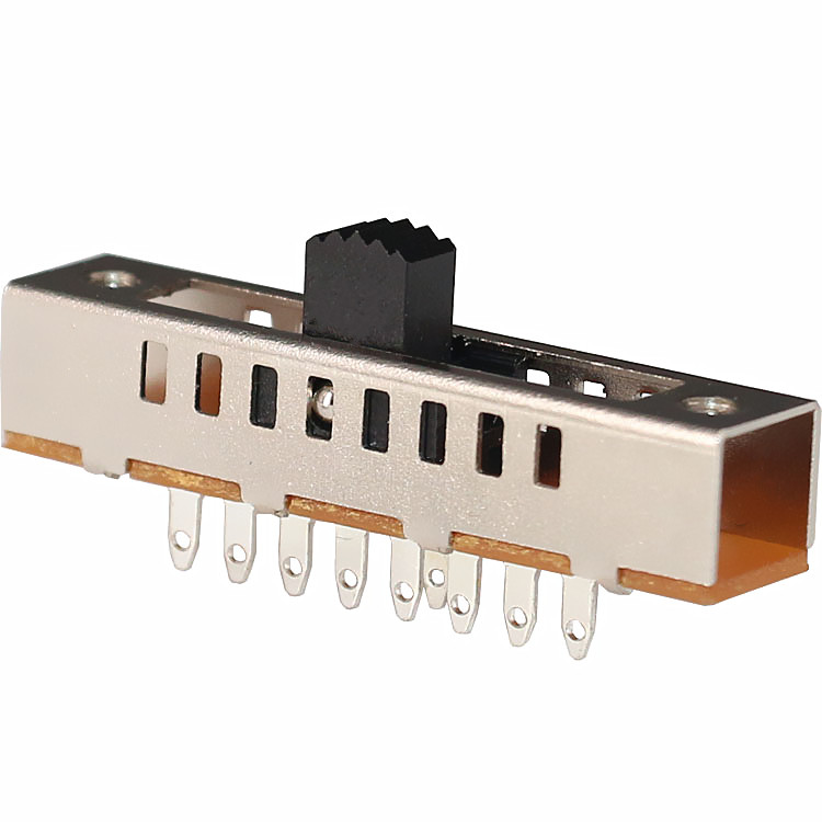 Slide Switch Main data Rating:DC 50V 0.3A~1A ContactResistance:< 100 mΩ InsulationResistance:≥ 100 MΩ Withstand Voltage:500V AC for 1 minute Operating Force:180~500gf Life cycles:10000次 Operationg Temperature:-16℃to+60℃ Storage Temperature:-40℃to+85℃ Complies with:RoHs&Reach