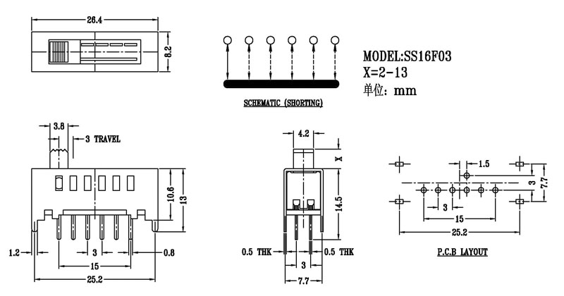 Slide Switch Main data Rating:DC 50V 0.3A~1A ContactResistance:< 100 mΩ InsulationResistance:≥ 100 MΩ Withstand Voltage:500V AC for 1 minute Operating Force:180~500gf Life cycles:10000次 Operationg Temperature:-16℃to+60℃ Storage Temperature:-40℃to+85℃ Complies with:RoHs&Reach