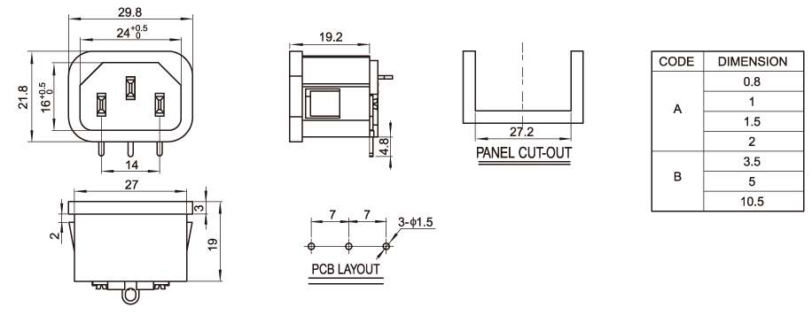 Model number: DB-14-4AP-S55 : Key words: the end socket of the product, the end power socket, the pin socket, AC power socket and socket. Directions: small home appliance character power supply;Main engine box socket;Power socket of the battery car;Electrical socket 29.8*21.8 feet inches: Current voltage: 10a 250V.