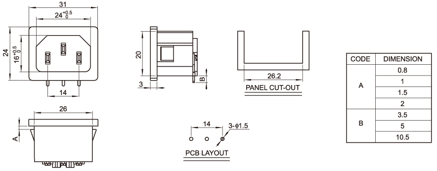 Model number: DB-14-4P-55 : Key words: the end socket of the product, the end power socket, the pin socket, AC power socket and socket. Directions: small home appliance character power supply;Main engine box socket;Power socket of the battery car;Electrical socket 31*24 feet inches: Current voltage: 10a 250V.
