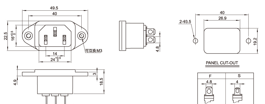 Standard: IEC 60320 C14 Rating:15A 250V AC / 10A 250V AC Insulation Resistance: 100MΩ 500V DC/1 minute Dielectric Strength: 2000V AC/1 minute Housing Material: Thermoplastic 94V-2~V-0