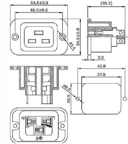 Standard: IEC 60320 J Rating:20A 250V AC / 16A 250V AC Insulation Resistance: 100MΩ 500V DC/1 minute Dielectric Strength: 2000V AC/1 minute Housing Material: Thermoplastic 94V-2~V-0