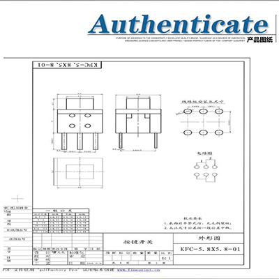 产品型号:KFC-5.8X5.8-01 / 脚位:直插6脚 / 产品寿命:50000次 / 额定负荷:30V 0.5A / 绝缘电阻:≥100MΩ / 接触电阻:≤30Ω / 环境温度:-40~70℃