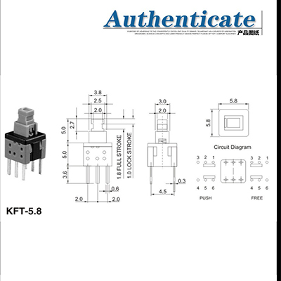 产品型号:KFT-5.8 / 脚位:直插6脚 / 产品寿命:50000次 / 额定负荷:30V 0.5A / 绝缘电阻:≥100MΩ / 接触电阻:≤30Ω / 环境温度:-40~70℃