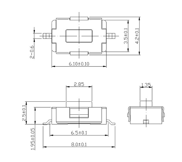 尺寸: 6.1X3.5mm 产品分类: 轻触开关 - B系列 / 3x6一型二型 应用 ※ 用于各种电子设备操作 ※ 音频设备,办公设备,通讯设备 ※ 测量仪器,电视机,电视录像机等 特点 ※ 高可靠的触点封装结构 ※ 大的按钮表面提高安装速度 ※ 回流可焊