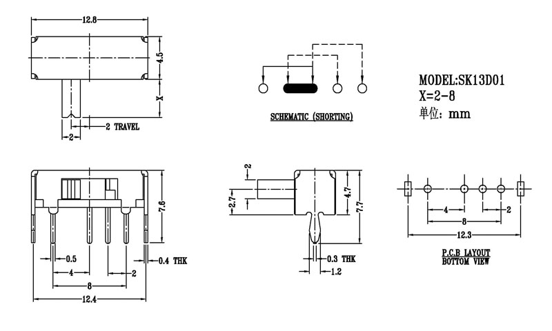 撥動開關主要技術參數: 使用功率/額定值:DC 50V 0.3A~1A 觸點電阻:< 100 mΩ 絕緣電阻:≥ 100 MΩ 耐壓:500V AC for 1 minute 撥動力:180~500gf 使用壽命:10000次 操作溫度:-16℃to+60℃ 儲存溫度:-40℃to+85℃ 符合標準:RoHs&Reach