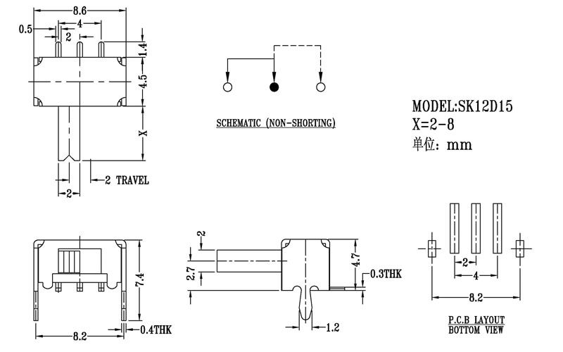撥動開關主要技術參數: 使用功率/額定值:DC 50V 0.3A~1A 觸點電阻:< 100 mΩ 絕緣電阻:≥ 100 MΩ 耐壓:500V AC for 1 minute 撥動力:180~500gf 使用壽命:10000次 操作溫度:-16℃to+60℃ 儲存溫度:-40℃to+85℃ 符合標準:RoHs&Reach