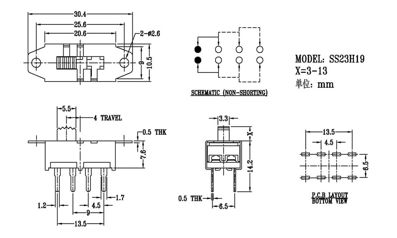 撥動開關主要技術參數: 使用功率/額定值:DC 50V 0.3A~1A 觸點電阻:< 100 mΩ 絕緣電阻:≥ 100 MΩ 耐壓:500V AC for 1 minute 撥動力:180~500gf 使用壽命:10000次 操作溫度:-16℃to+60℃ 儲存溫度:-40℃to+85℃ 符合標準:RoHs&Reach