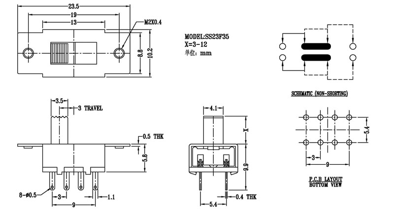 撥動開關主要技術參數: 使用功率/額定值:DC 50V 0.3A~1A 觸點電阻:< 100 mΩ 絕緣電阻:≥ 100 MΩ 耐壓:500V AC for 1 minute 撥動力:180~500gf 使用壽命:10000次 操作溫度:-16℃to+60℃ 儲存溫度:-40℃to+85℃ 符合標準:RoHs&Reach