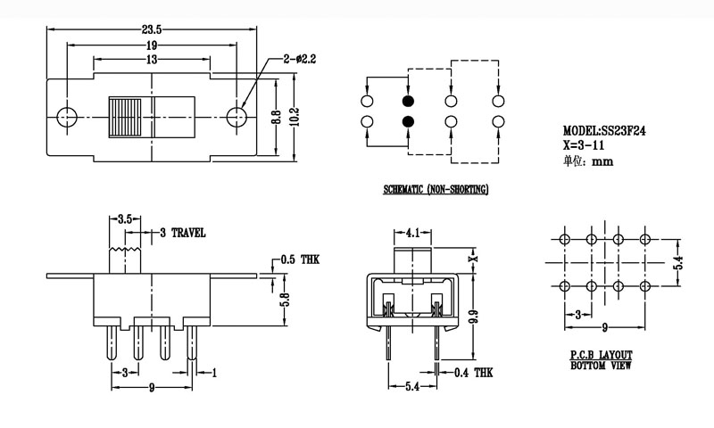 撥動開關主要技術參數: 使用功率/額定值:DC 50V 0.3A~1A 觸點電阻:< 100 mΩ 絕緣電阻:≥ 100 MΩ 耐壓:500V AC for 1 minute 撥動力:180~500gf 使用壽命:10000次 操作溫度:-16℃to+60℃ 儲存溫度:-40℃to+85℃ 符合標準:RoHs&Reach