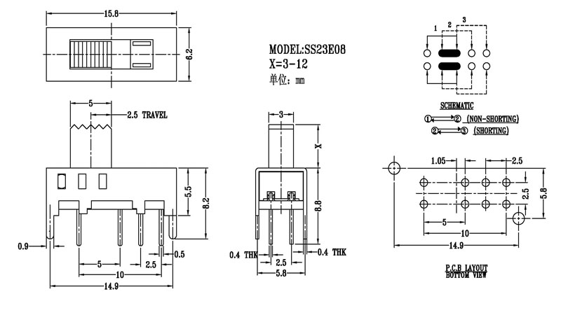 撥動開關主要技術參數 使用功率/額定值:DC 50V 0.3A~1A 觸點電阻:< 100 mΩ 絕緣電阻:≥ 100 MΩ 耐壓:500V AC for 1 minute 撥動力:180~500gf 使用壽命:10000次 操作溫度:-16℃to+60℃ 儲存溫度:-40℃to+85℃ 符合標準:RoHs&Reach