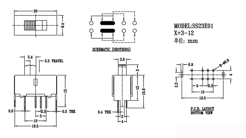 撥動開關主要技術參數 使用功率/額定值:DC 50V 0.3A~1A 觸點電阻:< 100 mΩ 絕緣電阻:≥ 100 MΩ 耐壓:500V AC for 1 minute 撥動力:180~500gf 使用壽命:10000次 操作溫度:-16℃to+60℃ 儲存溫度:-40℃to+85℃ 符合標準:RoHs&Reach