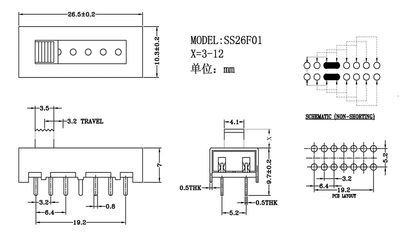 正拨拨动开关主要技術參數 使用功率/額定值:DC 50V 0.3A~1A 觸點電阻:< 100 mΩ 絕緣電阻:≥ 100 MΩ 耐壓:500V AC for 1 minute 撥動力:180~500gf 使用壽命:10000次 操作溫度:-16℃to+60℃ 儲存溫度:-40℃to+85℃ 符合標準:RoHs&Reach