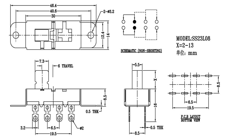 正拨拨动开关主要技術參數 使用功率/額定值:DC 50V 0.3A~1A 觸點電阻:< 100 mΩ 絕緣電阻:≥ 100 MΩ 耐壓:500V AC for 1 minute 撥動力:180~500gf 使用壽命:10000次 操作溫度:-16℃to+60℃ 儲存溫度:-40℃to+85℃ 符合標準:RoHs&Reach