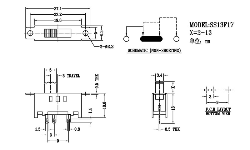 正拨拨动开关主要技術參數 使用功率/額定值:DC 50V 0.3A~1A 觸點電阻:< 100 mΩ 絕緣電阻:≥ 100 MΩ 耐壓:500V AC for 1 minute 撥動力:180~500gf 使用壽命:10000次 操作溫度:-16℃to+60℃ 儲存溫度:-40℃to+85℃ 符合標準:RoHs&Reach