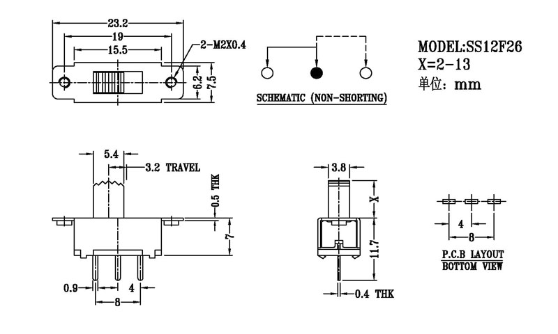 正拨拨动开关主要技術參數 使用功率/額定值:DC 50V 0.3A~1A 觸點電阻:< 100 mΩ 絕緣電阻:≥ 100 MΩ 耐壓:500V AC for 1 minute 撥動力:180~500gf 使用壽命:10000次 操作溫度:-16℃to+60℃ 儲存溫度:-40℃to+85℃ 符合標準:RoHs&Reach
