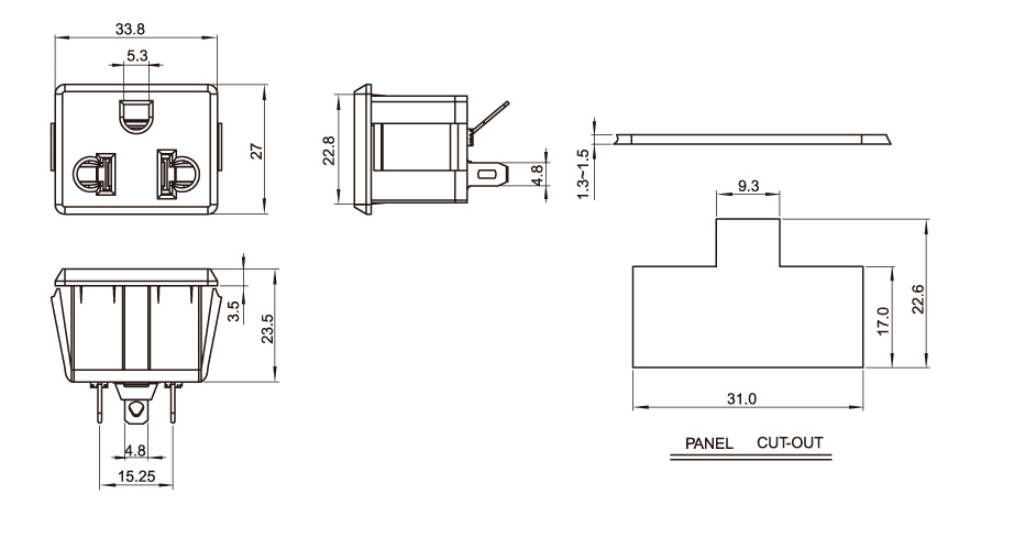 标准:美国RECEPTACLE 额定值:15A 125V AC 绝缘电阻:100MΩ500V DC / 1分钟 介电强度:2000V AC / 1分钟 外壳材料:热塑性塑料94V-2〜V-0