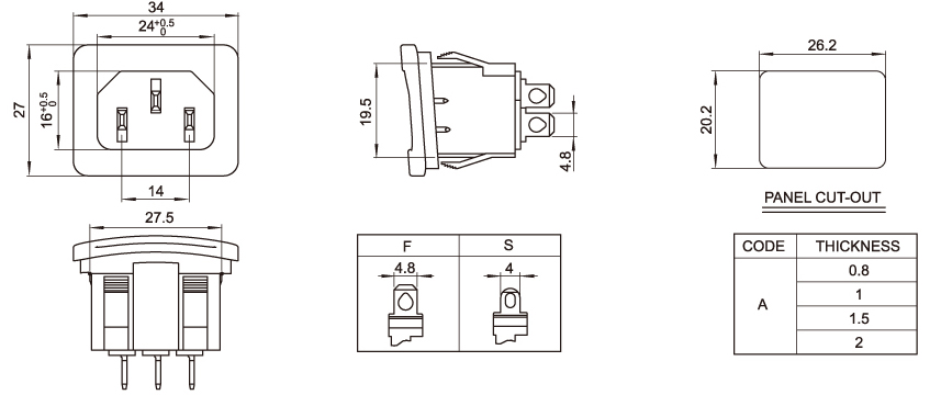 型 号:DB-14-11F: 关健词:品字尾插座、品字尾电源插座、品字插座、AC电源插座、器具插座 用 途:小家电品字电源;主机机箱插座;电瓶车电源插座;电器插座 尺 寸:34*27 电流电压:10A 250V