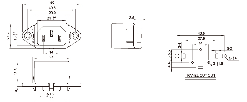 型 号:DB-14-13P-MM: 关健词:品字尾插座、品字尾电源插座、品字插座、AC电源插座、器具插座 用 途:小家电品字电源;主机机箱插座;电瓶车电源插座;电器插座 尺 寸:50*21.9 电流电压:10A 250V