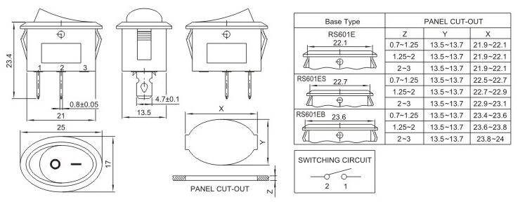 15*21二档二角 船型开关 跷板开关 IO电源开关 1.额定工作电压、电流Rating 3A/6A/15A 250V 2.使用温度范围Temperature -25+85℃ 3.接触电阻Contact Resistance <0.03Ω 4.动作力Actuating Force 1.3+0.5N 5.绝缘电阻Insulation Resistance >100MΩ 6.寿命(switching Life) 10000次