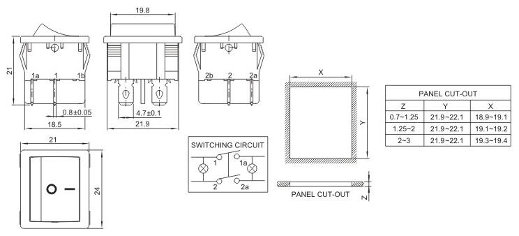 15*21 船型开关 跷板开关 IO电源开关 1.额定工作电压、电流Rating 3A/6A/15A 250V 2.使用温度范围Temperature -25+85℃ 3.接触电阻Contact Resistance <0.03Ω 4.动作力Actuating Force 1.3+0.5N 5.绝缘电阻Insulation Resistance >100MΩ 6.寿命(switching Life) 10000次