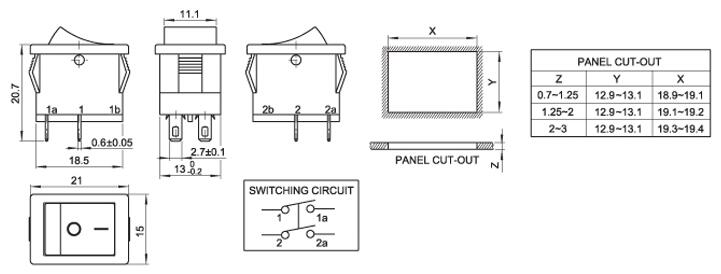 15*21 船型开关 跷板开关 IO电源开关 1.额定工作电压、电流Rating 3A/6A/15A 250V 2.使用温度范围Temperature -25+85℃ 3.接触电阻Contact Resistance <0.03Ω 4.动作力Actuating Force 1.3+0.5N 5.绝缘电阻Insulation Resistance >100MΩ 6.寿命(switching Life) 10000次