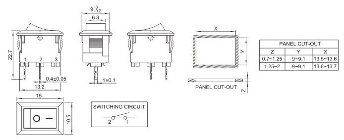 10*15 船型开关 跷板开关 IO电源开关 1.额定工作电压、电流Rating 3A/6A/15A 250V 2.使用温度范围Temperature -25+85℃ 3.接触电阻Contact Resistance <0.03Ω 4.动作力Actuating Force 1.3+0.5N 5.绝缘电阻Insulation Resistance >100MΩ 6.寿命(switching Life) 10000次