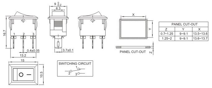 10*15 船型开关 跷板开关 IO电源开关 1.额定工作电压、电流Rating 3A/6A/15A 250V 2.使用温度范围Temperature -25+85℃ 3.接触电阻Contact Resistance <0.03Ω 4.动作力Actuating Force 1.3+0.5N 5.绝缘电阻Insulation Resistance >100MΩ 6.寿命(switching Life) 10000次