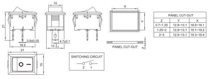 10*15 船型开关 跷板开关 IO电源开关 1.额定工作电压、电流Rating 3A/6A/15A 250V 2.使用温度范围Temperature -25+85℃ 3.接触电阻Contact Resistance <0.03Ω 4.动作力Actuating Force 1.3+0.5N 5.绝缘电阻Insulation Resistance >100MΩ 6.寿命(switching Life) 10000次
