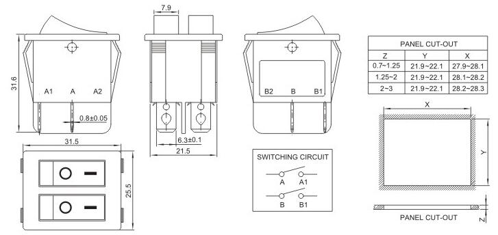 25*31.5 船型开关 跷板开关 IO电源开关 1.额定工作电压、电流Rating 3A/6A/15A 250V 2.使用温度范围Temperature -25+85℃ 3.接触电阻Contact Resistance <0.03Ω 4.动作力Actuating Force 1.3+0.5N 5.绝缘电阻Insulation Resistance >100MΩ 6.寿命(switching Life) 10000次